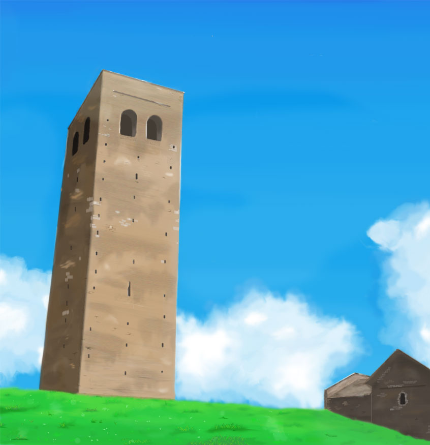 イタリアのサン・レオという町にある司教座協会の鐘楼の塔です。今回初めて空と草原を描いてみたのですが失敗に終わりました;まだまだ課題が多そうです・・・